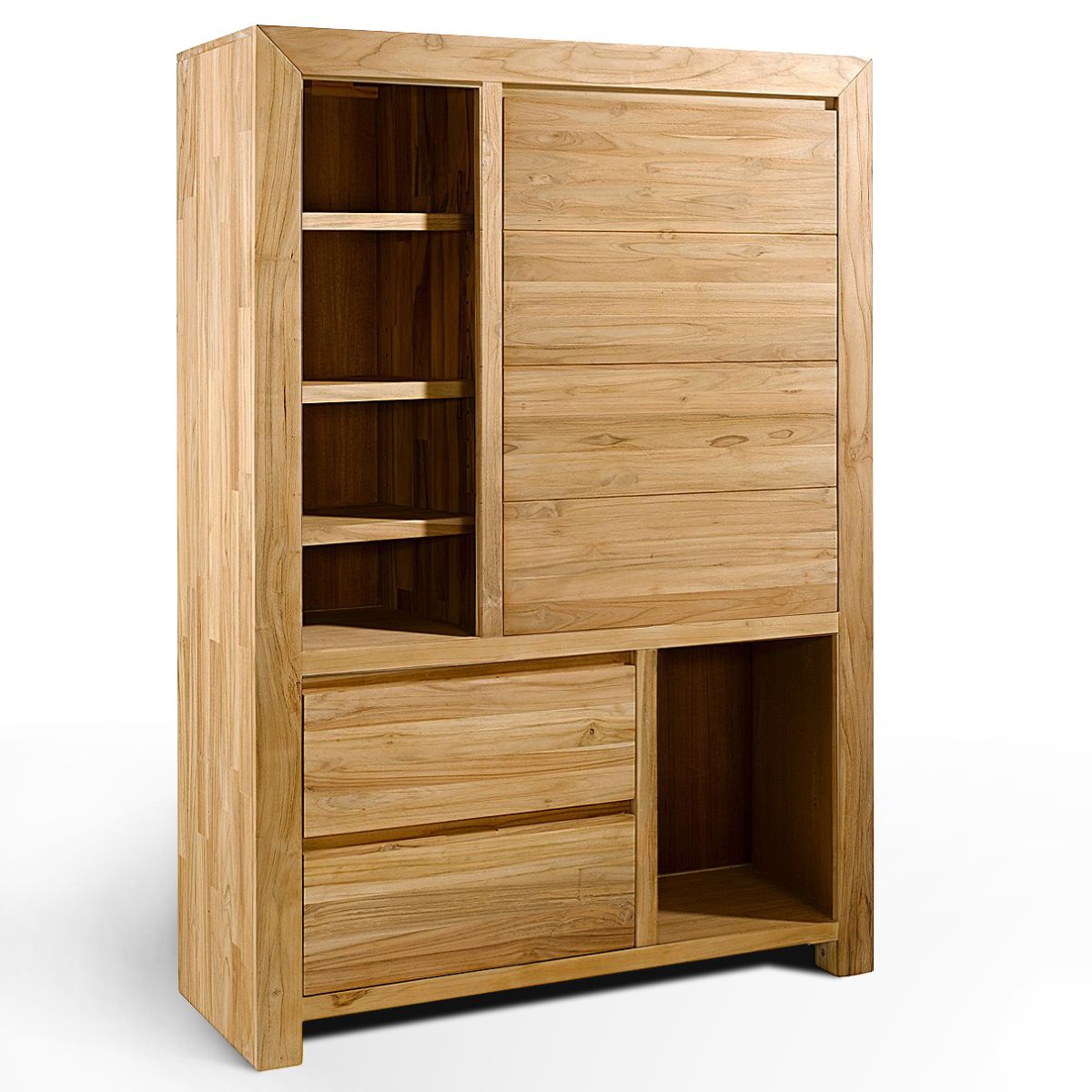 Contemporary and modern armoire with rustic distress finish. Handmade of teak wood, 1 door and oven shelves top, 2 drawers and a shelf bottom.