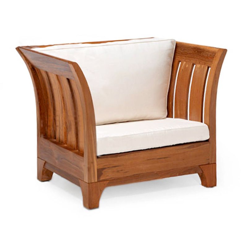 Classic curved outward arm side and backrest sofa 1 seat. Made of teak solid wood,wooden slats seat and backrest. Seat cushion and backrest pillows included.
